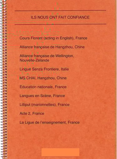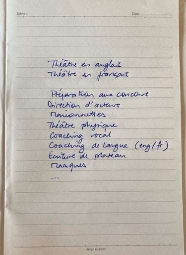 Nous proposons des ateliers en français et en anglais, adaptés aux envies des participants que ce soit en coaching personnel ponctuel notamment dans le cadre de préparation aux auditions, ou dans un travail de compagnie plus long jusqu'à la création d'un spectacle.